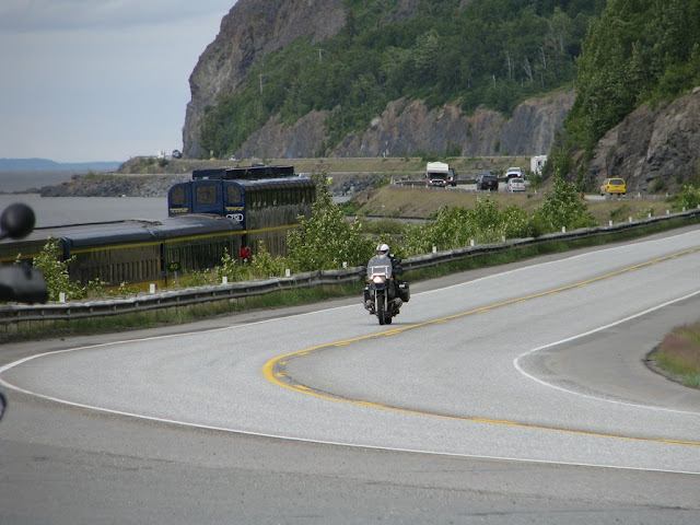 Tim took these next four pics. I thought they were very nice. This one captured a lot. Me, the road, the hillside, the train, traffic, and the Turnagain Arm. |